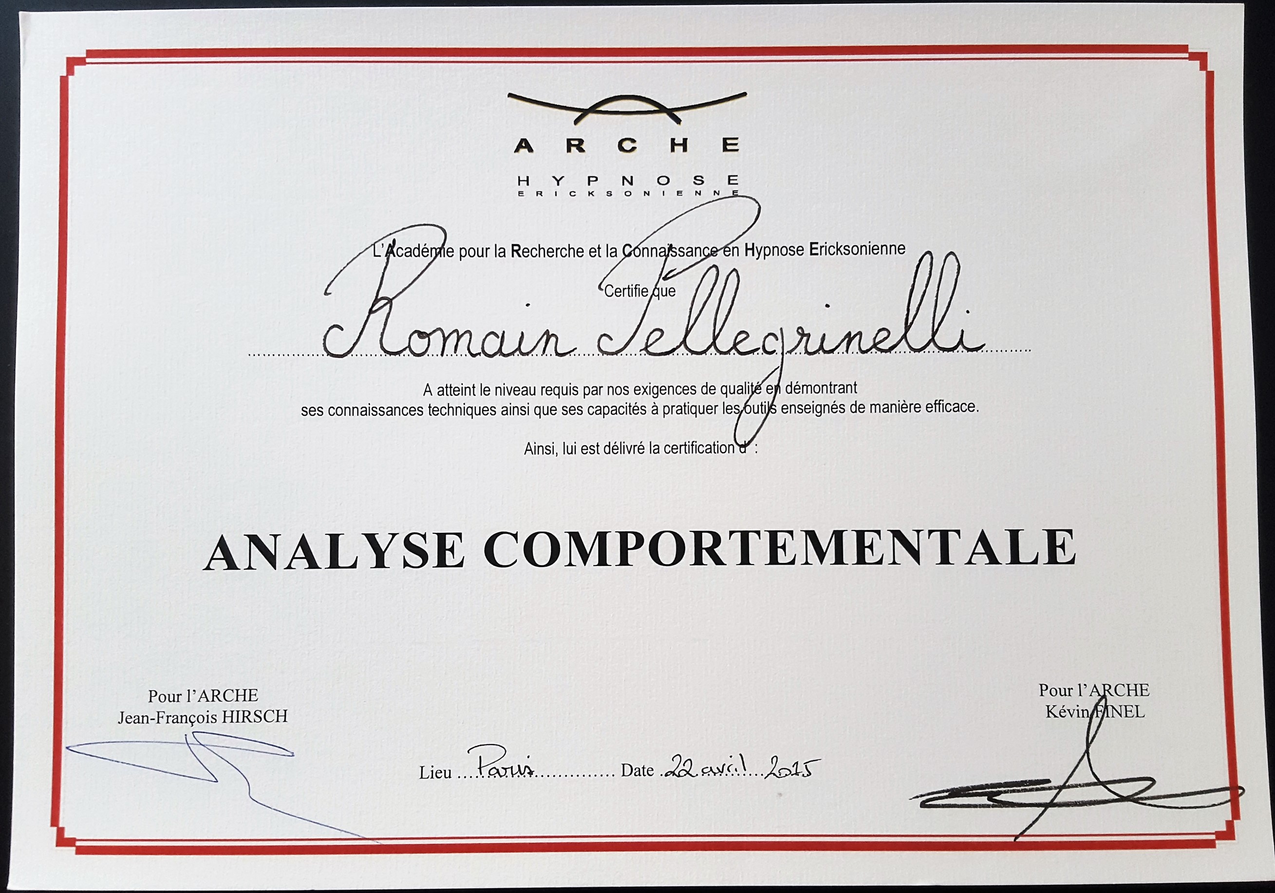 Certification de praticien en analyse comportementale de Romain Pellegrinelli, Hypnopraticien à Bussy st georges / Val d’europe en Seine et Marne 77