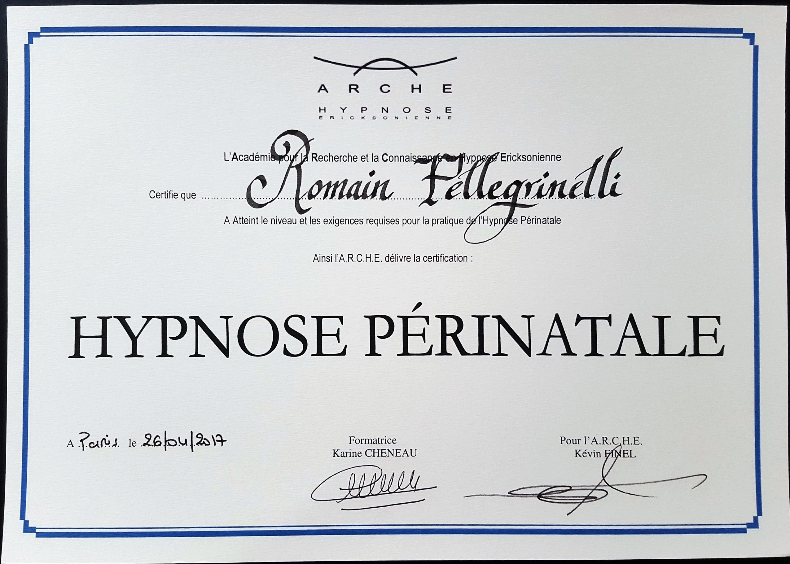 Certification de praticien en hypnose ericksonienne périnatale de Romain Pellegrinelli, Hypnopraticien à Bussy st georges / Val d’europe en Seine et Marne 77