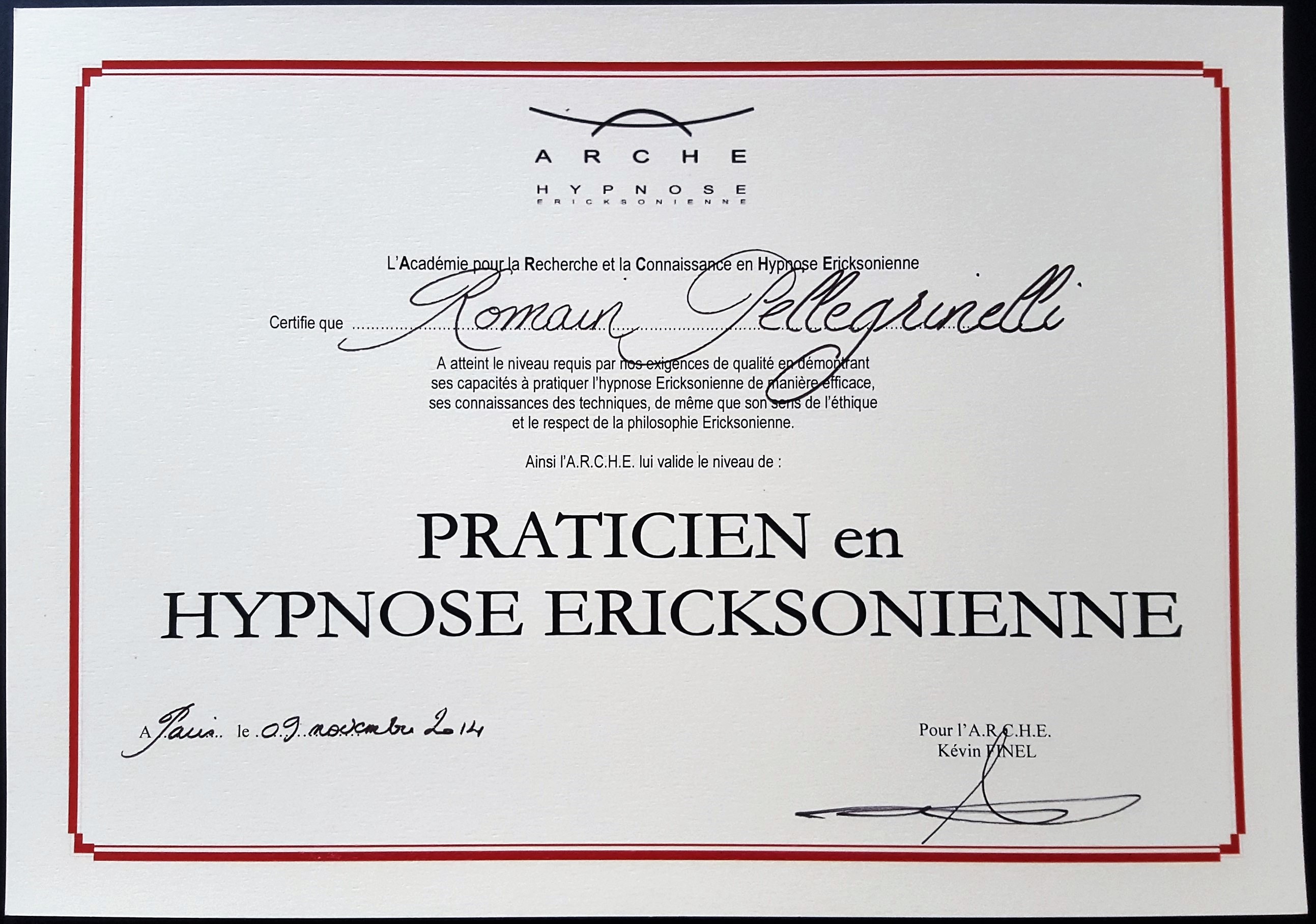 Certification de praticien en hypnose ericksonienne de Romain Pellegrinelli, Hypnopraticien à Bussy st georges / Val d’europe en Seine et Marne 77